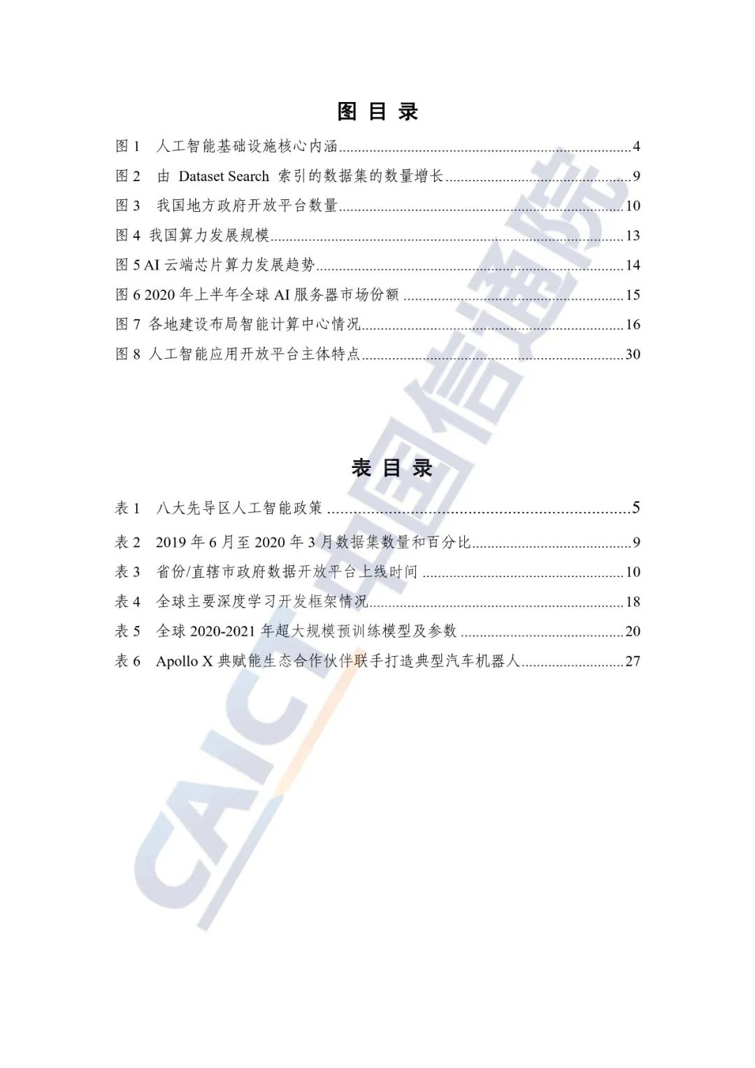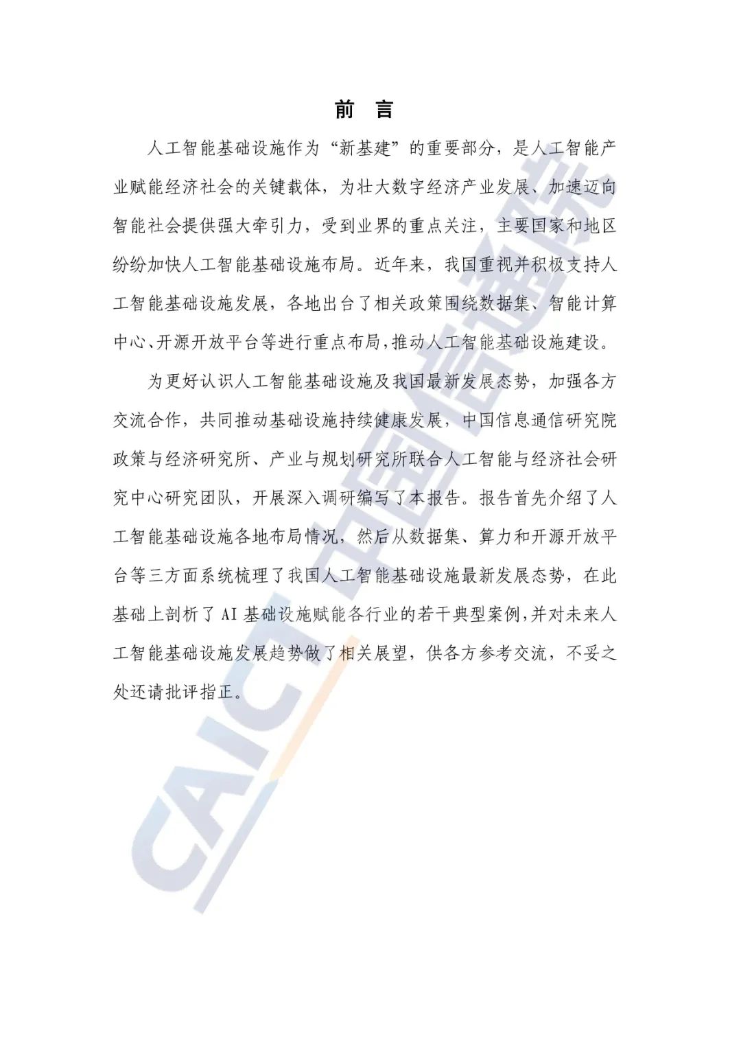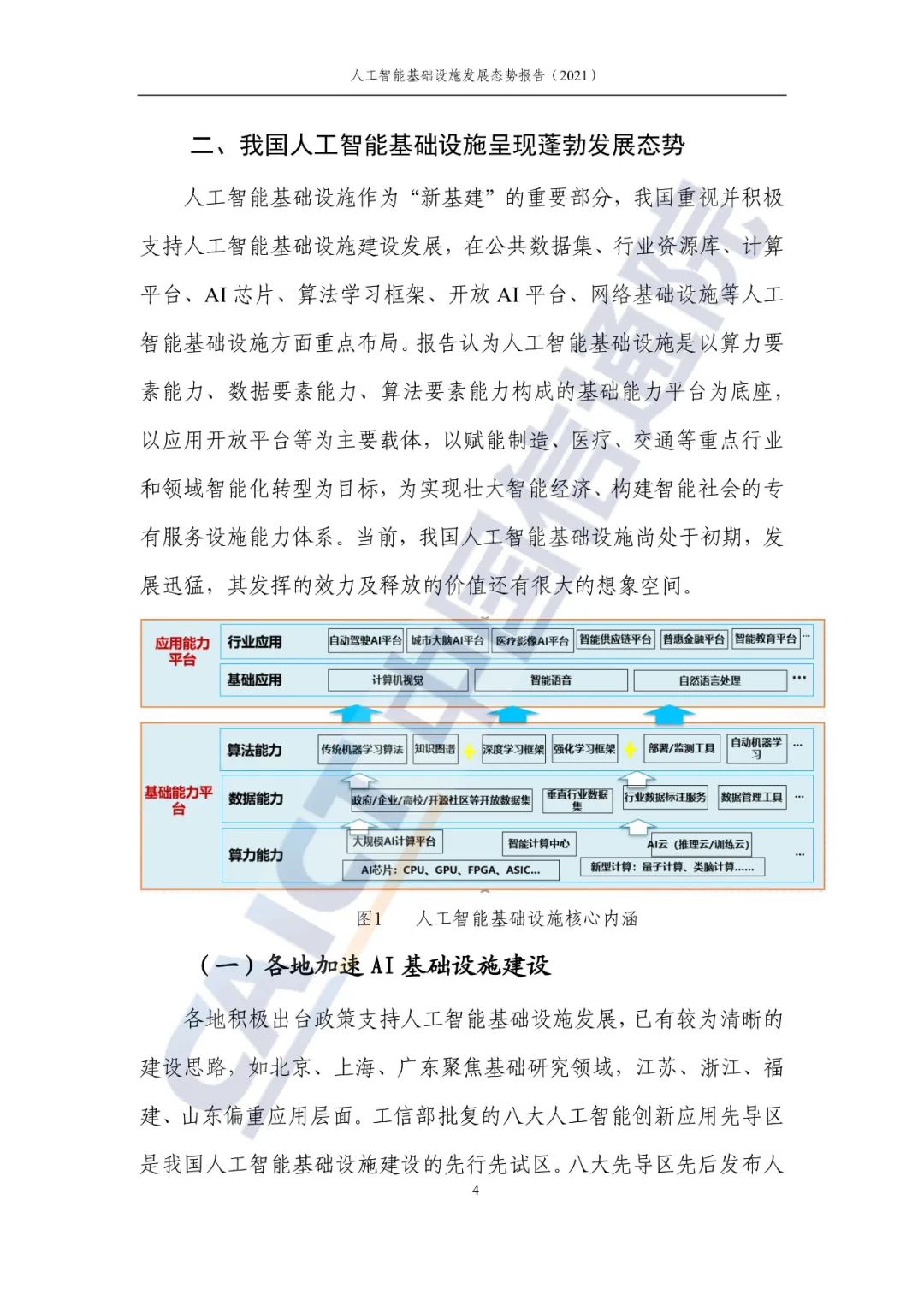 人工智能基础设施作为“新基建”的重要部分,我国重视并积极支持人工智能基础设施建设发展,在公共数据集、行业资源库、计算平台、AI 芯片、算法学习框架、开放 AI 平台、网络基础设施等人工智能基础设施方面重点布局。报告认为人工智能基础设施是以算力要素能力、数据要素能力、算法要素能力构成的基础能力平台为底座,以应用开放平台等为主要载体,以赋能制造、医疗、交通等重点行业和领域智能化转型为目标,为实现壮大智能经济、构建智能社会的专有服务设施能力体系。当前,我国人工智能基础设施尚处于初期,发展迅猛,其发挥的效力及释放的价值还有很大的想象空间。