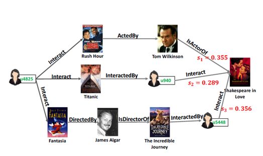 如上图所示,在MovieLens-1M中随机选择的一个用户u4825,并从她的交互记录中选择电影“恋爱中的莎士比亚”。然后,我们提取连接用户-项对的所有限定路径,得到每个路径的分数s1 = 0.355, s2 = 0.289, s3 = 0.356,即模型更倾向于认为用户u4825是通过路径3和电影“恋爱中的莎士比亚”产生交互关系。