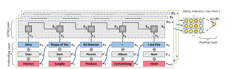 模型一共分为三层:在Embedding层对路径的每一个行为做embedding的计算。对于给定三元组,分别计算实体名称,实体类型和关系(或交互方式)的embedding后再拼接得到最终特征表示。LSTM层将路径上的每个单元的特征表示按照时间顺序输入并且将最后时刻的隐藏层状态作为该路径的特征表示。在pooling层,将所有路径的特征表示集合输入两层前馈神经网络,再对输出做带权重的池化操作得到最后的预测结果。