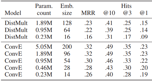 文章在4个数据集WN18、FB15K、YAGO3-10、Countries上进行实验,与DisMult、R-GCN等模型进行了对比。实验结果表明:0.23M个参数的ConvE就与1.89M个参数的DistMult有相近的性能表现,总的来说ConvE的参数效率是R-GCN的17倍以上,是DistMult的8倍以上。此外,作者还发现ConvE在YAGO3-10和FB15k-237上的表现比在WN18RR上好,因为前两者包含入度很大的结点,这种复杂的KG需要更深层的模型,而浅层模型比如DistMult则在较简单的KG上有优势。