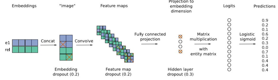 文章提出一种多层卷积神经网络模型用于知识图谱的链接预测任务。与自然语言处理中常用的一维卷积不同,文章通过把多个向量堆叠成矩阵,就可以像图形一样用二维卷积核来抽取embedding之间的关系。