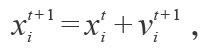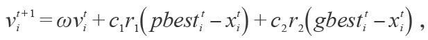其中xit 代表第i 个粒子在第t 代的位置,其在t+1代的速度vit+1可以通过粒子前一代的位置( xit )、当前最优的位置( pbestit )、整个种群中最好的粒子的位置( gbestit )以及粒子上一代的速度(vit )计算出来,具体的表达式如下: