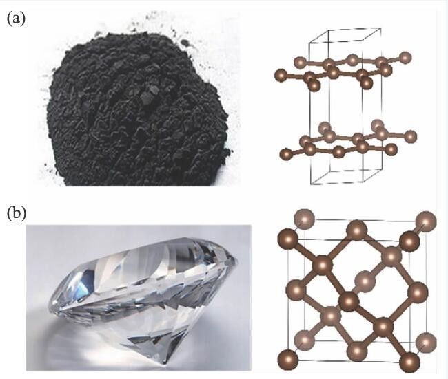 图1 (a)石墨及其微观晶体结构;(b)金刚石及其微观晶体结构