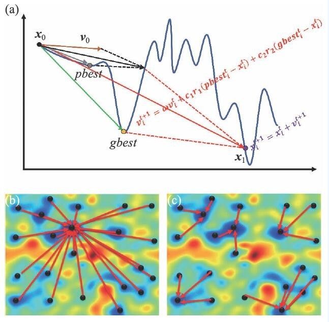 图5 (a)一维势能面上粒子群优化算法示意图;(b) 全局粒子群优化算法示意图;(c)局域粒子群优化算法示意图