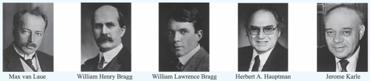 图2 因在物质结构测量方法上的贡献而获得诺贝尔奖的科学家。Max van Laue 因发现晶体的X射线衍射而获得1914 年诺贝尔物理学奖,William Henry Bragg和William Lawrence Bragg因用X射线分析晶体结构所做出的贡献而获得1915年诺贝尔物理学奖,Herbert A. Hauptman和Jerome Karle因在使用直接方法确定晶体结构方面的贡献获得了1985 年诺贝尔化学奖