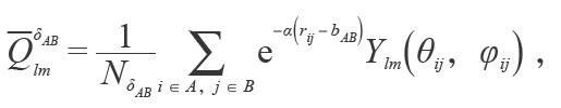 其中rij表示由原子i 指向j 矢量的长度。θij,φij是rij在极坐标下的方位角,A(B)表示第i( j)个原子种类。Ylm 是球谐函数, NδAB表示A与B元素成键的数目,bAB表示每种成键的最短长度,α是一个可调参数,为了消除坐标依赖,将这个矩阵用转动不变的形式进行表示: