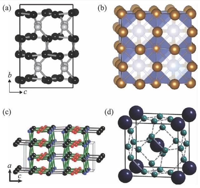 图6 (a)单质锂的高压半导体相oC40 结构;(b)地核环境下XeFe3的晶体结构;(c)高压下H2S金属相的晶体结构;(d)高压下CaH6的晶体结构