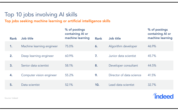 考生选择AI的参考之一就是大厂招聘的数据。据Indeed发布的职位统计,当今公司需求最大十份AI技能工作: