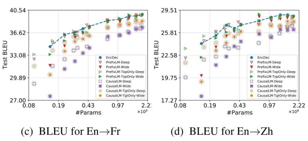 ▲ 这里列出本文最重要的实验图:在两个数据集上,各种LM变体以及encoder-decoder的BLEU分数-参数量曲线图。