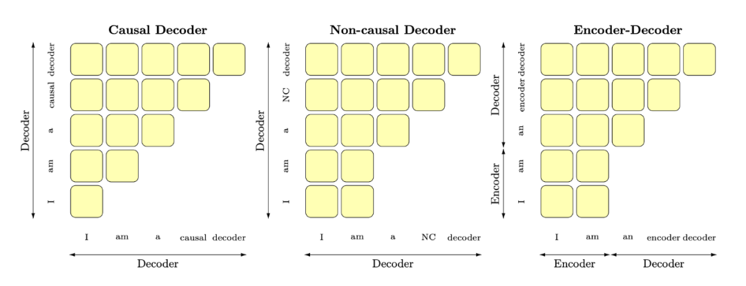 ▲ 作者三种基本架构的注意力机制图 (attention map)。简言之,causal decoder LM只允许source sentence中每个token对前面token做attention,后两者是双向attention的。