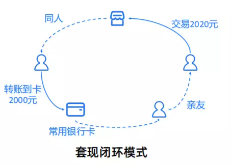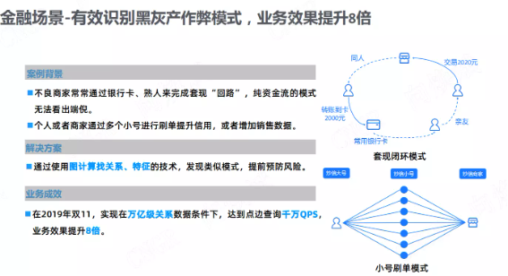 洪博士提到,第一阶段,一般企业刚接触到图数据库 TuGraph,多数用于传统大数据分析手段不能及时处理的场景。在现实生产生活等数据应用场景中,数据关系是错综复杂的,越来越多复杂关系需实时分析。例如,金融系统现在需要实时定位洗钱团伙的刷单、套现、跑分、借助合法账户洗钱的行为。如下图示意,不良商家常常通过银行卡、熟人来完成套现“回路”,纯资金流的数据模式无法看出端倪,需要借助图数据模式发现此类闭环模式,提前预防风险。