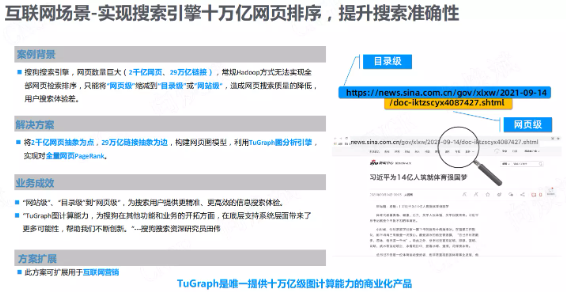 以互联网场景为例,TuGraph 可以将 2 千亿网页抽象为点,29 万亿链接抽象为边,构建网页图模型,利用 TuGraph 图分析引擎,实现对全量网页 PageRank。提升搜索准确性,提高用户搜索体验。