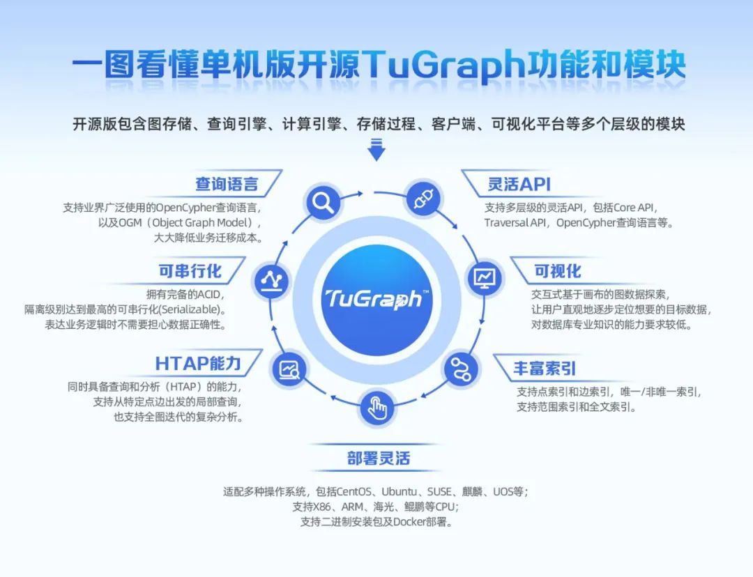 本次开源的单机版 TuGraph 提供了完备的图数据库基础功能和成熟的产品设计,拥有完整的事务支持和丰富的系统特性,单机可部署,使用成本低,支持 TB 级别的数据规模,满足市面上绝大多数用户的部署需求。TuGraph 采用 Apache2.0 协议,在 Github 和 Gitee 上进行托管。