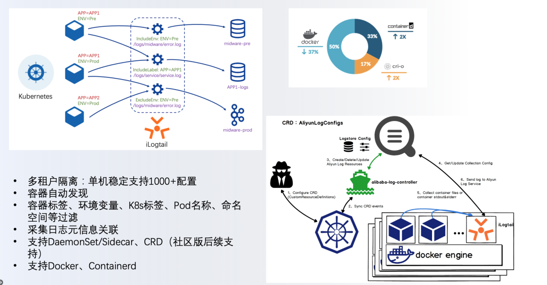 自K8s问世以来,docker运行时一直是主流,但是随着K8s将dockershim移除,K8s官方推荐优先选择containerd 或 CRI-O作为容器运行时。docker份额目前虽然还是主流但是已经在呈逐年下降的趋势,contailerd、cri-o地位逐年都在快速上升。因此,从K8s支持全面性上,iLogtail需要支持主流的运行时,目前已经支持Docker和Containerd两种容器引擎的数据采集。