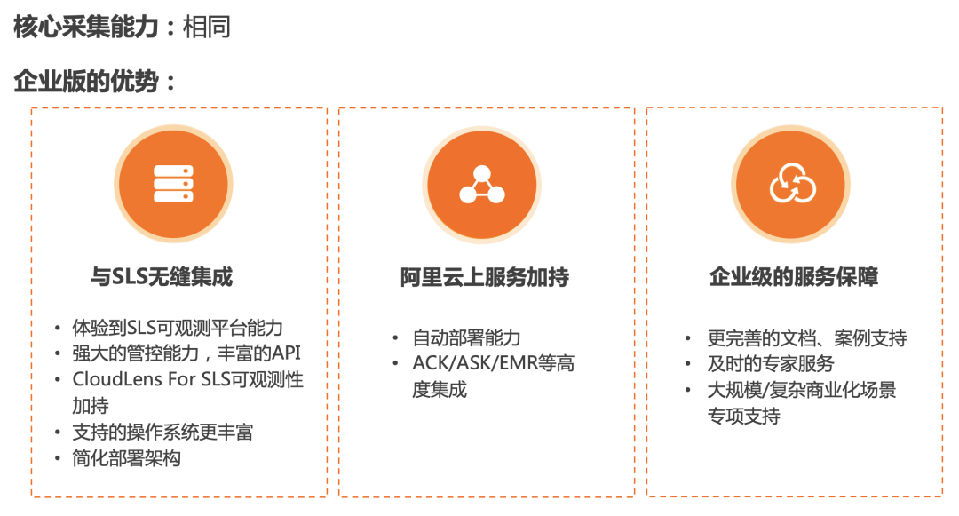 iLogtail开源,秉承技术共享与开发者共建的原则,所以核心功能是完全开源的,因此可以认为在核心采集能力上(包括采集处理功能、性能、可靠性等)与企业版是完全对标的。