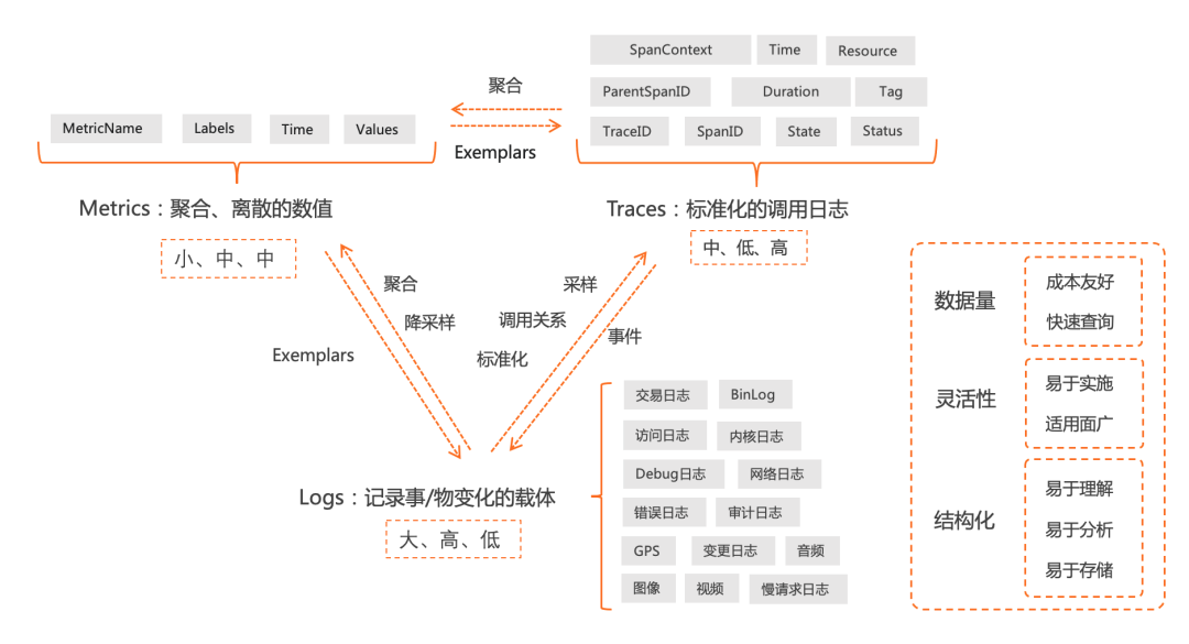 三者间的转换关系:Logs在调用链场景结构化后其实可以转变为Trace,在进行聚合、降采样操作后会变成Metrics。