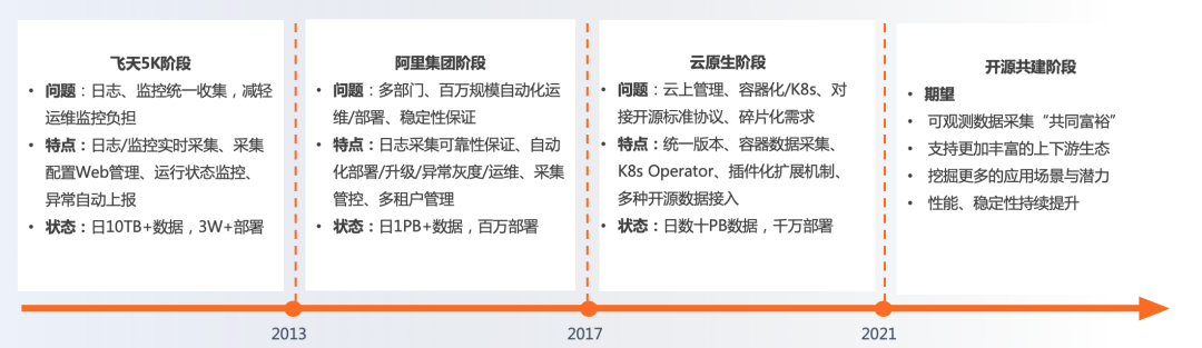 iLogtail的前身源自阿里云的神农项目,自从2013年正式孵化以来,iLogtail始终在不断演进。
