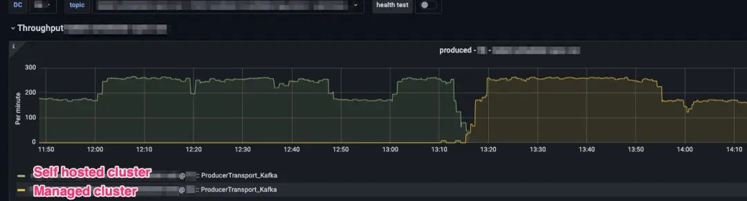 在下图中,我们可以看出,生产者是如何成功地从自托管集群切换到管理式集群的(随着越来越多的 Pod 被重新启动并读取新的配置,因此吞吐量会降低)。