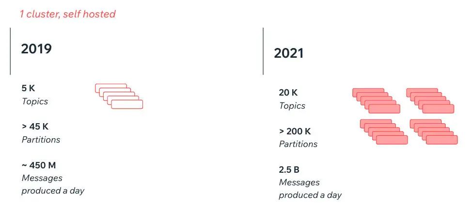 我们的自托管集群规模从 2019 年的 5K Topics,大于 45K 分区增加到 2021 年的 20K Topics, 大于 200K 分区。
