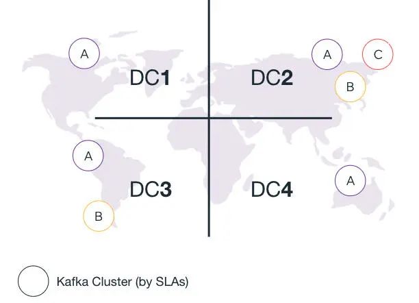 我们决定根据不同的服务级别协议(Service-level agreement,SLA)对 Kafka 集群进行分割。例如,在 CI/CD 管道和数据迁移案例中,服务级别协议是有别于生产服务的。请注意,由于每个数据中心的作用不同,并非所有数据中心都拥有同样数目的 Kafka 集群。