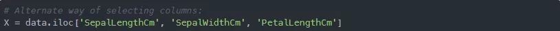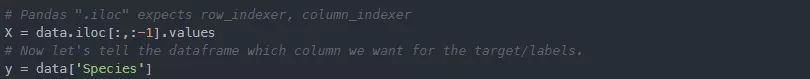 现在我们需要定义特征和分类。我们可以使用Pandas库通过对数据表进行切片,并使用iloc()选择特定的行/列来轻松地实现这一点: