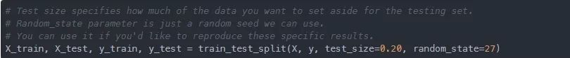 现在我们已经有了我们想要的特征和分类,我们可以使用sklearn的train_test_split()函数将数据分割为训练集和测试集: