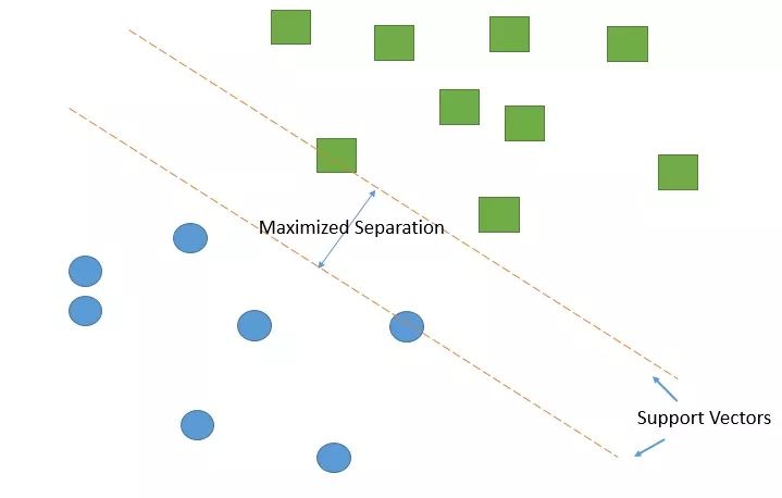 支持向量机的工作原理是在不同的数据点集群之间画一条线,将它们分组到一些类中。线的一边的点是一类,另一边的点属于另一类。