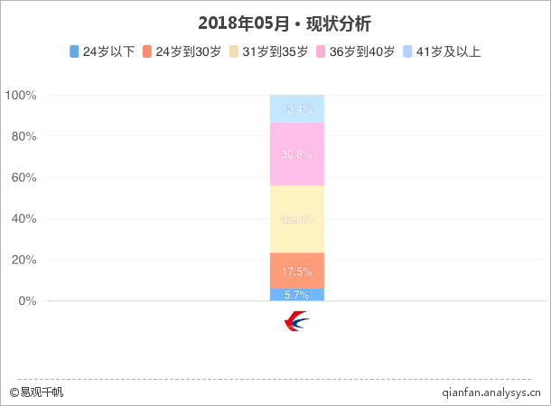 从用户年龄分布来看,东方航空的用户群体中,31岁到35岁用户占比最大,达到32.6%,其次为36-40岁,占比30.8%,第三位的是24-30岁,占比17.5%。