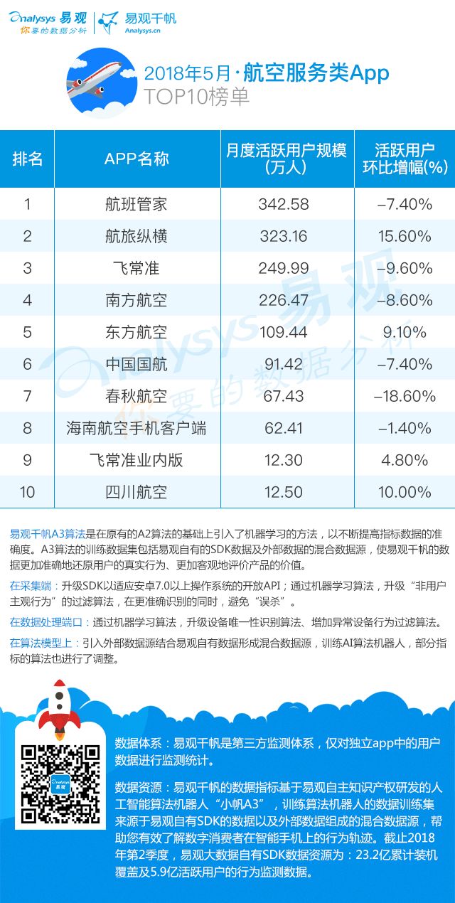 根据易观千帆监测数据,5月航空服务类应用TOP10榜单中,航班管家活跃人数继续位列榜首,但与排在第二的航旅纵横差距在逐步缩小。