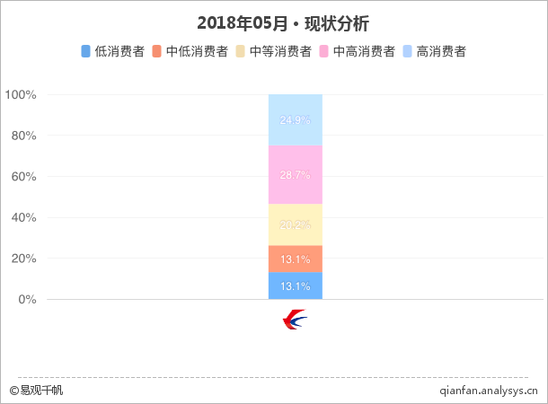 从用户消费能力来看,具有中高、高和中等消费能力的用户占据东方航空用户的前三位,分别占比28.7%、24.9%和20.2%,占比合计达到73.8%。