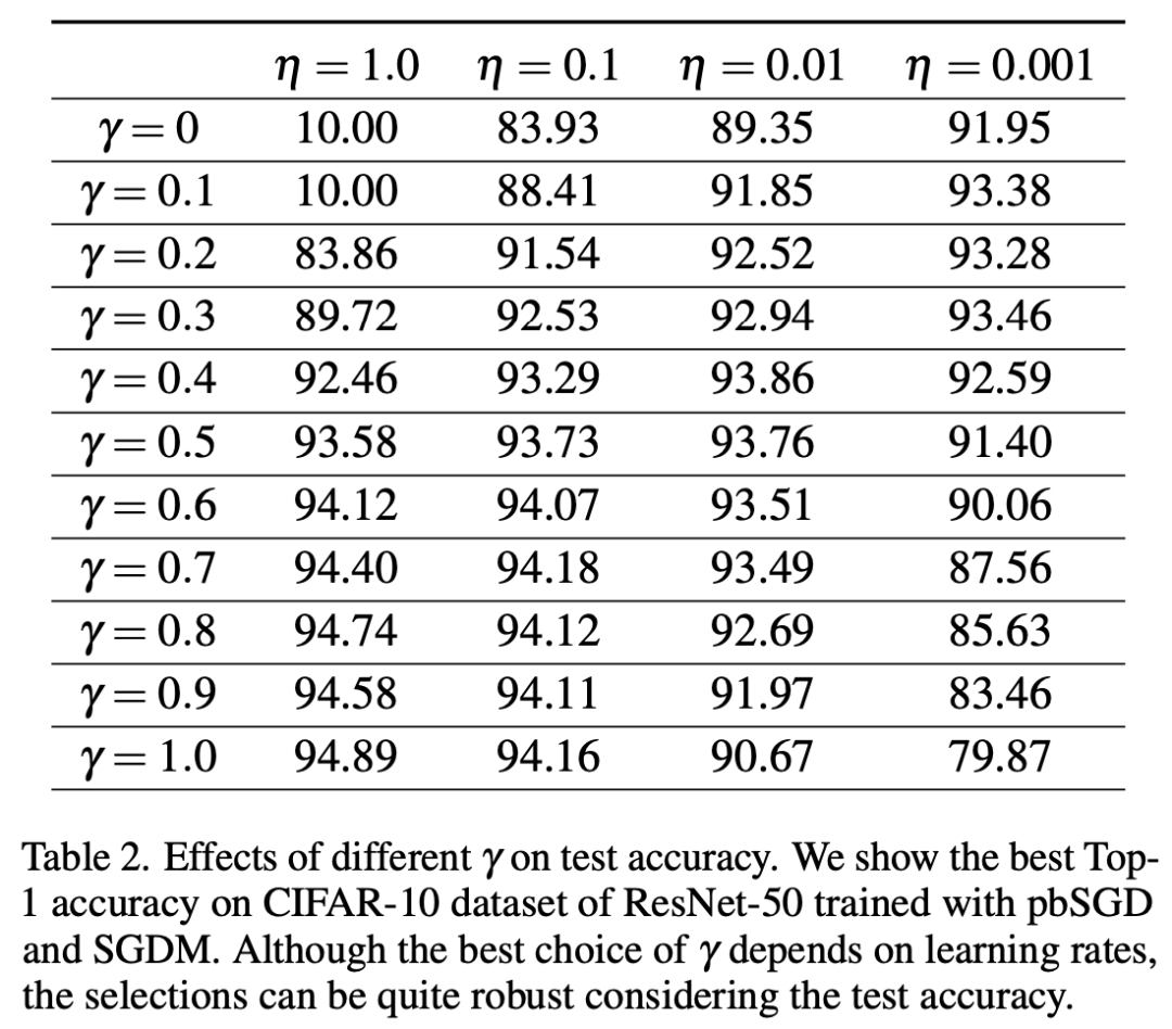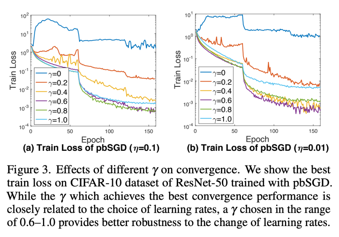 在实验中我们发现,超参数gamma的引入不仅可以加速收敛,同时可以改善对测试集准确率和收敛性的鲁棒性。(gamma=1.0时pbSGD变为了SGD算法)