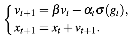 动量技术是从物理过程中获取的灵感,已将其成功地应用于SGDM,并在大多数情况下可以获得神经网络的更佳训练结果。我们这里同样提出pbSGD的动量加速形式,即pbSGDM,其参数更新规则为: