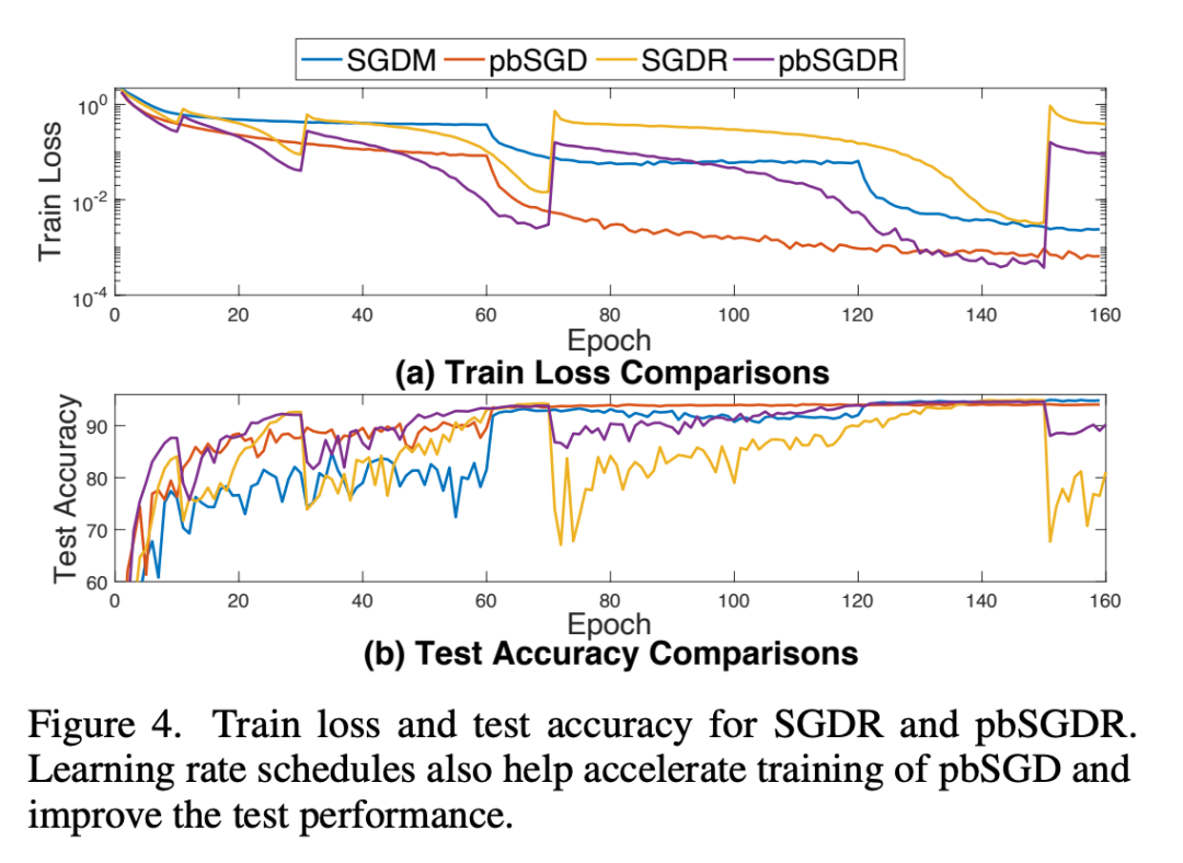 pbSGD只对梯度项做了改变,因此可以与其他优化方法很好的结合起来去进一步提升整体的性能。我们选择了restart的学习率策略用于对比实验,从结果中可以看出结合了学习率策略的pbSGD取得了更好的结果。