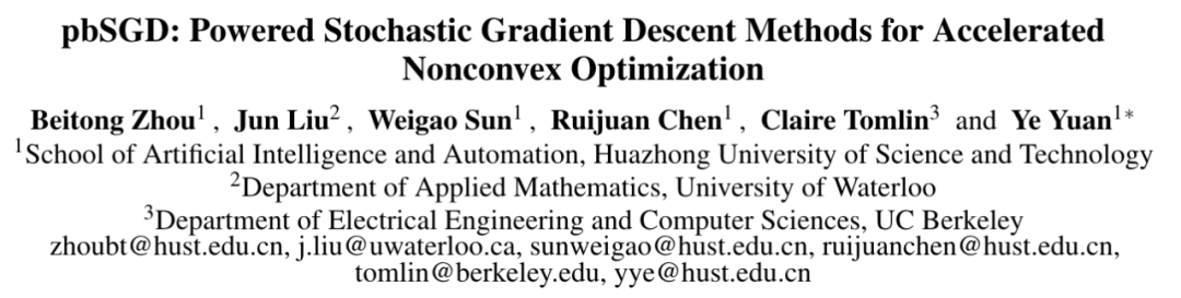 文《pbSGD: Powered Stochastic Gradient Descent Methods for Accelerated Non-Convex Optimization》,该论文由华中科技大学、滑铁卢大学和加州大学伯克利分校合作完成。