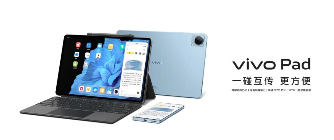 vivo Pad 搭载 11 英寸 16:10 比例的 2.5K 分辨率 LCD 屏幕,支持 120Hz 高刷新率。平板搭载骁龙 870 处理器平台,预装 OriginOS HD 系统,专为平板优化。