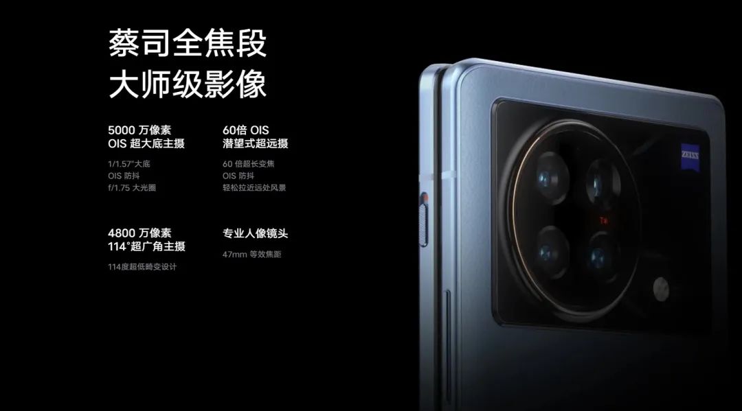 影像方面,vivo X Fold 搭载后置四摄,分别是 5000 万像素三星 GN5 主摄、4800 万像素超广角摄像头、1200 万像素专业人像摄像头、800 万像素 5 倍光变潜望式长焦摄像头。手机全系镜头搭载蔡司 T* 镀膜,蔡司光学镜头,可以充分发挥相机传感器的性能。该机前置摄像头采用挖孔形态,像素数为 1600 万像素。
