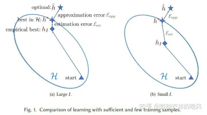 在小样本任务中,用小样本训练的模型很容易陷入对小样本的过拟合以及对目标任务的欠拟合,导致实际训练的模型h_I的表现与基于现有的特征和算法能训练的最优模型h*能达到的表现的差距无法通过训练和超参数调整有效的缩小,使模型的整体表现较差(基于足量样本训练的模型和基于小样本训练的模型分别见fig. 1的a和b)。