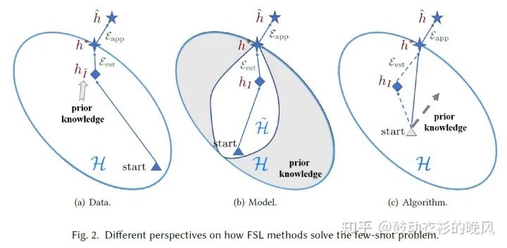 根据机器学习模型在小样本上难以学习的原因,Few-Shot Learning从三个角度解决问题,(1)通过增多训练数据提升h_I(Data)、(2)缩小模型需要搜索的空间(Model)、以及(3)优化搜索最优模型的过程(Algorithm)。