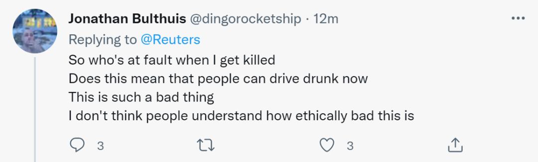 对于 NHTSA 的新规,有些网友似乎并不买账。有人表示,当我死于车祸时,谁来负责?这是否意味着现在人们可以醉酒开车了。这太糟糕了,在道德上也是如此。