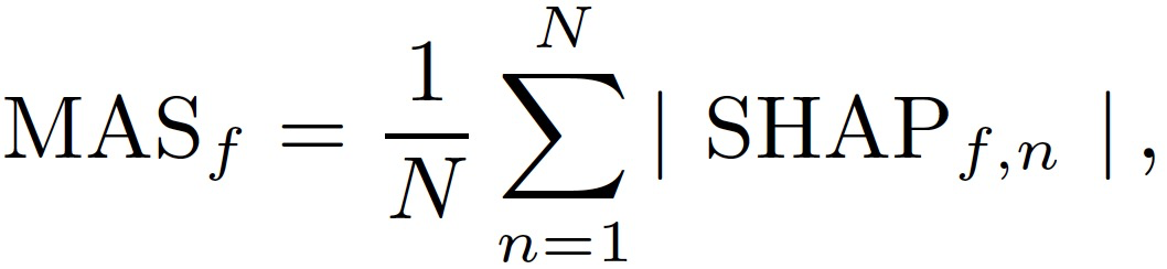 本文使用 SHapley 加法解释(SHapley Additive exPlanations,SHAP)来进行特征重要性分析。SHAP 是一个模型无关的框架,它量化了特征对模型预测的影响。SHAP 通过为每个预测的每个特征计算一个形状值,估算了复杂模型族的特征重要性 [9]。通过将预测数据点的所有形状值绘制在形状摘要图中,可以确定每个特征对预测结果的影响。通过计算每个特征 f 的平均绝对形状(Mean Absolute SHAP,MAS)可以对特征影响进行定量分析。具体地,MAS 计算如下: