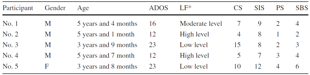 共有 11 名儿童参与了这项研究,但只有 5 名儿童符合纳入标准,即:(1)基于 DSM-5 的自闭症诊断,(2)根据自闭症诊断观察量表(ADOS)进行诊断确认的,(3)在执行目标行为方面存在明显的困难的。所有的儿童都是从自闭症特兰西瓦尼亚协会(Cluj Napoca,罗马尼亚)招募的,这是一个为自闭症儿童提供专门服务的中心。参与测试的儿童的资料见表 1。