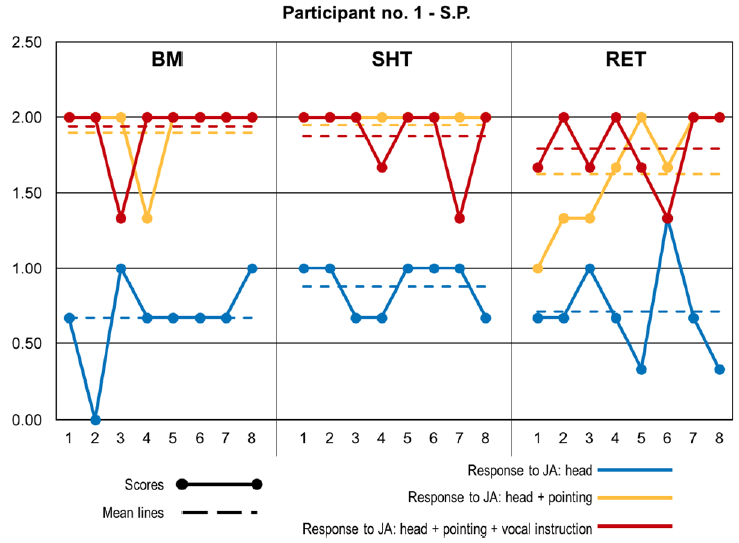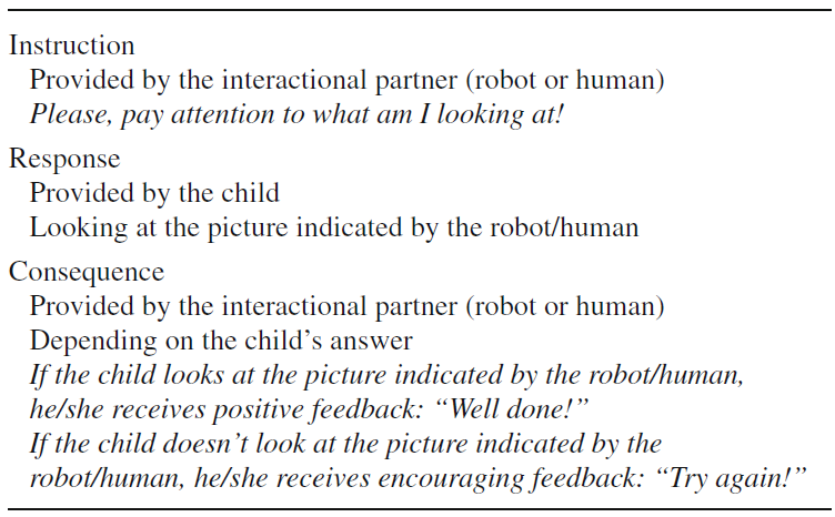 每个疗程持续约 10 分钟,每天都会重复进行这些疗程。RET 和 SHT 之间的顺序是随机的,以避免在实验中出现顺序效应。基线的疗程是在与治疗师的互动中进行的,这部分实验满足了离散实验的要求。对孩子进行测试,在没有明确的提示、提示消退或后援的情况下,验证他们是否会对伙伴发出的辨别性刺激做出反应。JA 任务的结构包括:指示(instruction)、反应(response)和结果(consequence),具体见表 2。