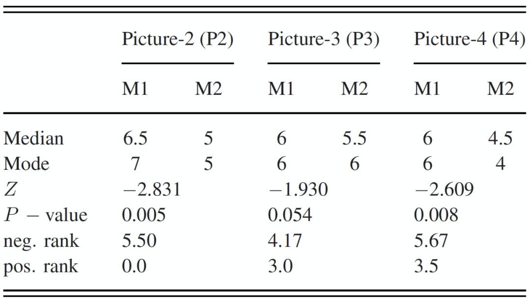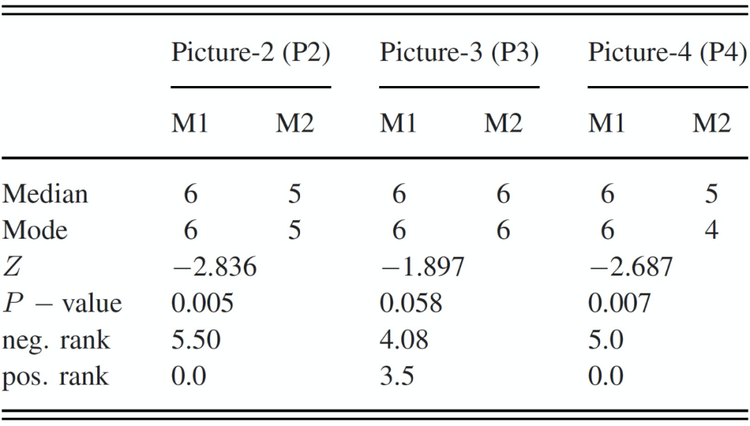 对于问卷 Q1(见表 1),当访问者观看图片 P2 时,两种方法(M1 和 M2)之间的差异具有统计学意义(Z=−2.831,p<0.01)。对于图片 P4,两种方法之间的差异也具有统计学意义(Z=−2.609,P<0.01)。对于图片 P3,两种方法(M1 和 M2)之间没有显著性差异。因此,为了在交互启动过程中成功的进行目光接触,当参观者分别观看图片 P2 和 P4 时,机器人应选择左侧和右侧的运动路径。当参观者看到图片 P3 时,机器人可以选择左侧或右侧的运动路径进行眼神接触。