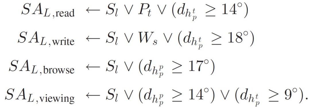 S_l 表示自发观看。如果检测到自发观看,则假定此人对某项任务没有特别注意,即,表示检测到低注意水平。对于阅读和写作任务,除了头部姿势的改变外,本文还考虑了「翻页」(Pt)和「停止写作」(Ws)等行为来检测低注意水平。对于上式来说,如果特定的头部姿势变化且稳定性大于或等于 3 帧,则相应任务的注意力水平较低。否则,表示注意力水平较高,当前的注意力集中在任务上。