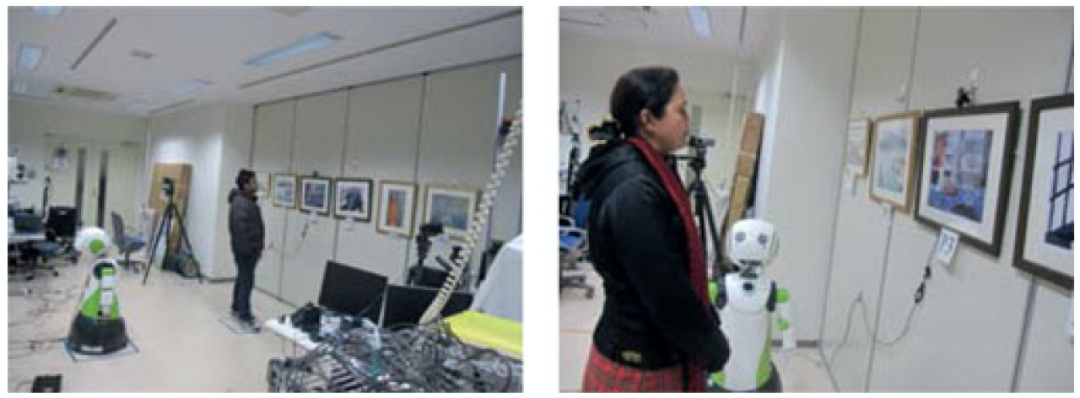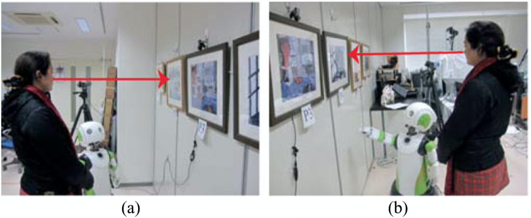 将六幅画(P1–P6)挂在同一高度的墙上(见图 8(a))。这些画被放置在不同的地方,让参与者从一个固定的站立位置将 VFOA 固定在一幅特定的画上。一个 USB 摄像头(位于画作(P3)的顶部,用于检测访客的凝视和头部方向。P2、P3 和 P4 分别放置在 LNPFF、CFV 和 RNPFV 区域。将 Robovie-R3 眼睛(见图 8(b))替换为计算机图形生成的用于注视通信的投影眼睛(见图 8(c))。为了确认参观者能够与机器人进行眼神接触,在机器人头部下方放置了一个 USB 摄像头(见图 8(d))。在交互场景中,每个参与者被要求站在一个固定的位置,她 / 他的目光和头部方向可以在画作中自由的移动,最后,他 / 她会将注意力固定在图片 P2、P3 或 P4 上(见图 9)。
