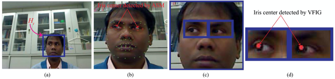 图 3. (a) 检测到的头部及其在图像中的位置。(b) 提取人脸特征点。(c) 基于人脸特征点的眼睛区域估计。(d) 检测到眼睛区域内的虹膜中心。