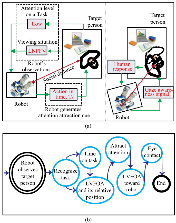 本文所提出的方法如图 1 所示。在启动交互模块(见图 1(a)的左侧部分),机器人识别并跟踪目标人的 VFOA。如果它们最初是面对面的,机器人会产生一个感知信号,并与目标人进行眼神接触。否则,机器人会试图通过识别目标人当前的任务来吸引目标人的注意力。机器人检测当前 VFOA 的水平,直到时长达到 T_s(T_s 为预先设置的用于表示 VFOA 持续的最大时间跨度的参数)。图 1(b)给出了这一方法的具体执行步骤。机器人在时间 t 使用低级或高级的 VFOA(取决于目标人的当前任务),根据目标人的移位 VFOA 的观察情况来生成吸引注意力(Attention attraction,AA)信号(弱或强)。