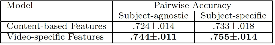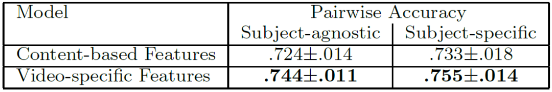表 2. 通过使用基于内容的功能与基于内容的 + 视频特定功能的 RF 模型的 5 倍交叉验证,实现标准误差的成对准确度。