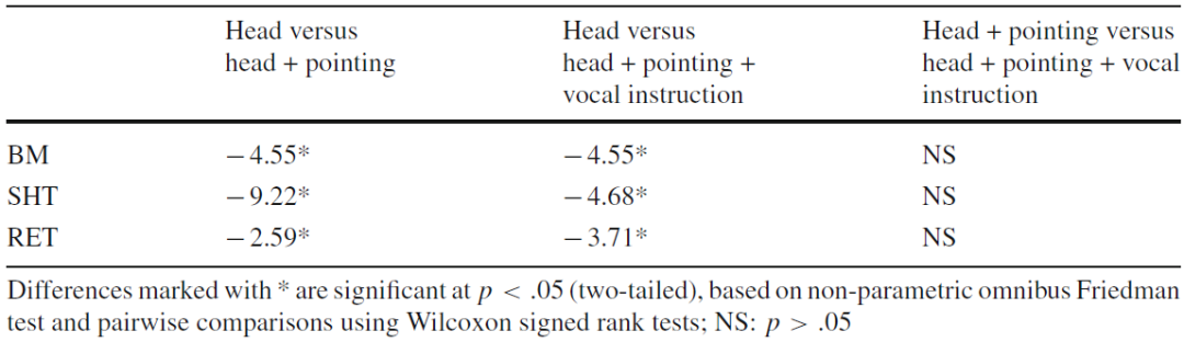 SHT 的结果也相似,综合非参数(Friedman)检验显示三种类型的提示有显著差异,chi^2(2)=15.08,p=.001。两两比较表明,头部定向(head orientation)情况下的得分明显低于指示方法(pointing),Z=−2.60,p=.009,d=−9.22,以及指示(pointing)+ 口头指令(vocal instruction),Z=−2.59,p=.010,d=−4.68。指示(pointing)与指示(pointing)+ 口头指令(vocal instruction)之间无显著性差异,p>0.05。
