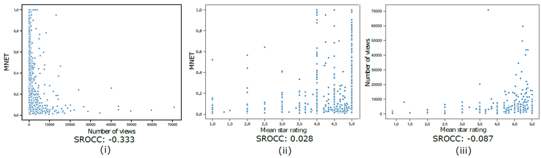 图 1. 散点图,显示了(i)浏览量与 MNET 之间的关系,(ii)视频讲座的平均星级与 MNET 之间的关系,(iii)平均星级与浏览量之间的关系,以及 Spearman 的等级相关系数(SROCC)。